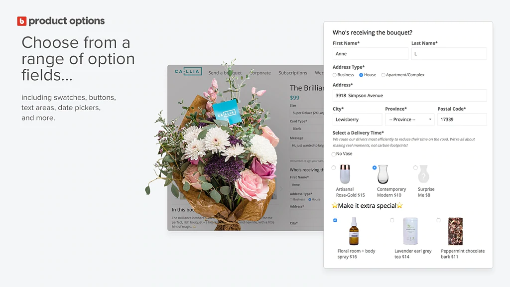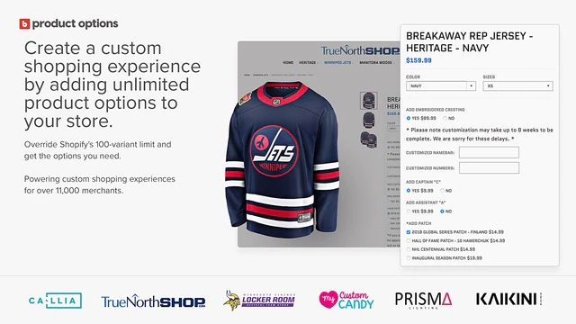 また、開発者のサポートによりカスタム製品ビルダー(製品のカスタムを画面上の製品写真に反映させる)や追加したオプションのライブプレビューなどの独自のアプリケーション機能を作成することもできます。