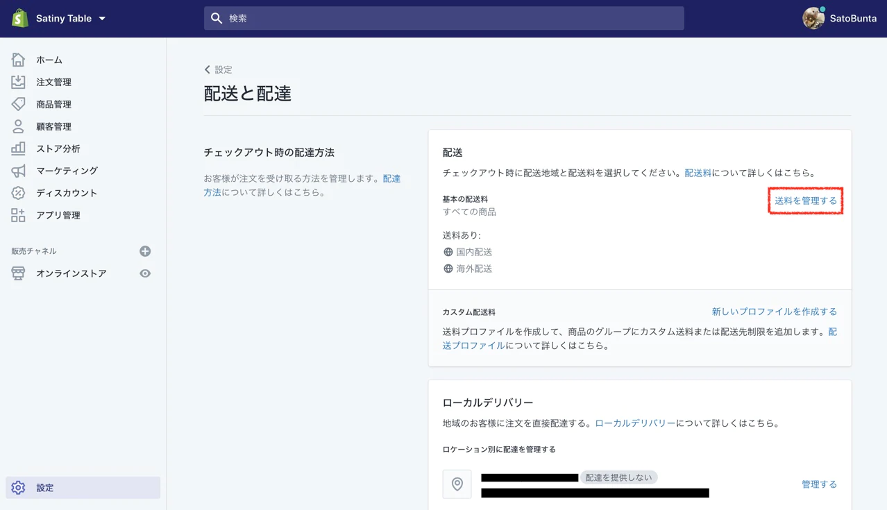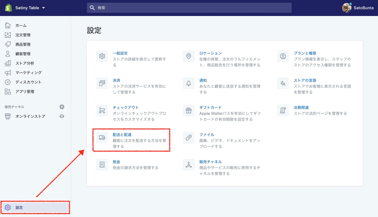 まず最初に、管理画面で[設定>配送と配達]を選択します。