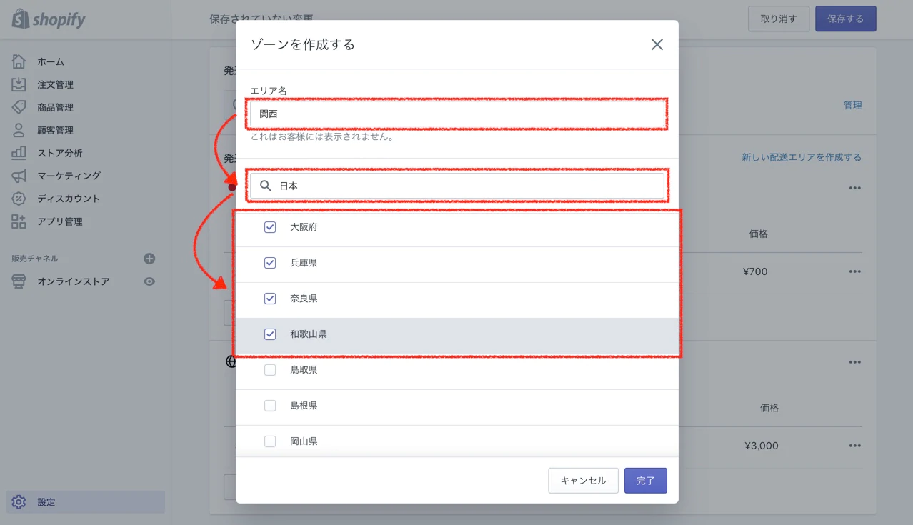 「ゾーンを作成する」で先ほどのプロセスを繰り返しエリアごとの送料の設定をします。例では「関西」エリアの作成をしています。