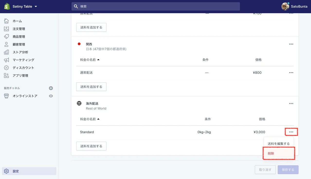 最後にデフォルトの送料では世界中への配送が可能な設定がされているため海外配送が不要な場合は「海外配送」の横の[・・・]より[削除]をクリックして海外配送の設定を削除しておきましょう。