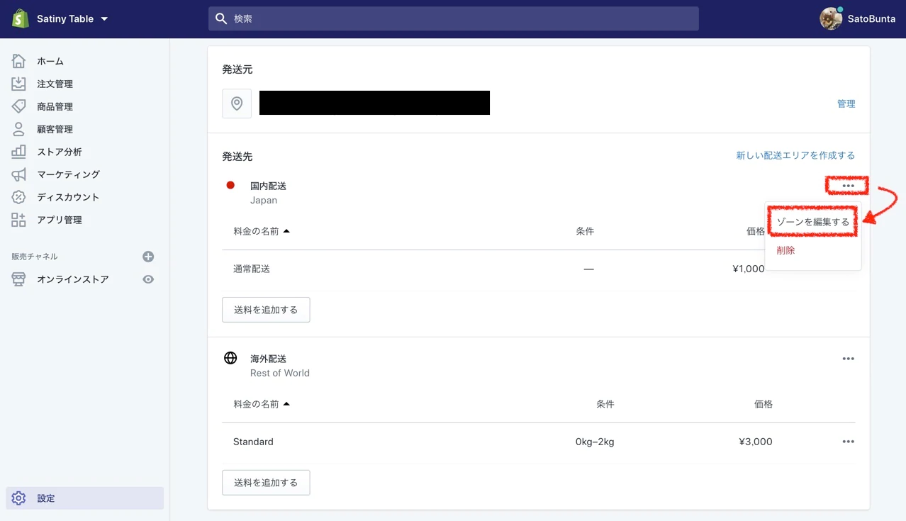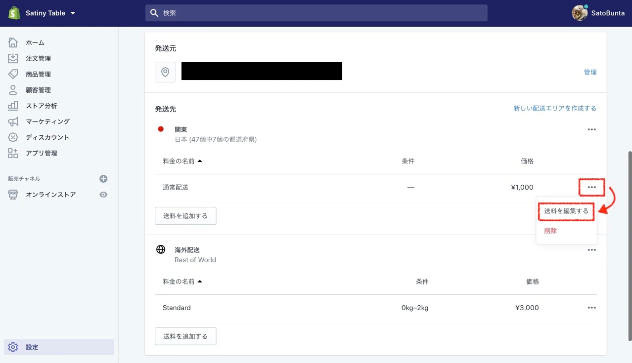 先ほど設定したエリアの「通常配送」の横の[・・・]をクリックし、タブの[送料を編集する]を選択します。