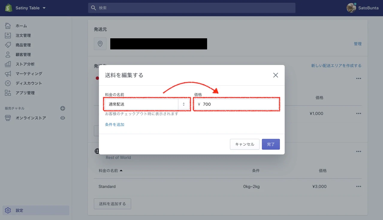 次に「料金の名前」と「価格」を入力します。例では名前は通常料金のままで送料は700円と設定を行なっていきます。なお「料金の名前」はユーザーのチェックアウト時に表示される項目となります。