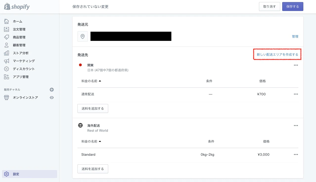 発送先の[新しい配送エリアを作成する]をクリックします。