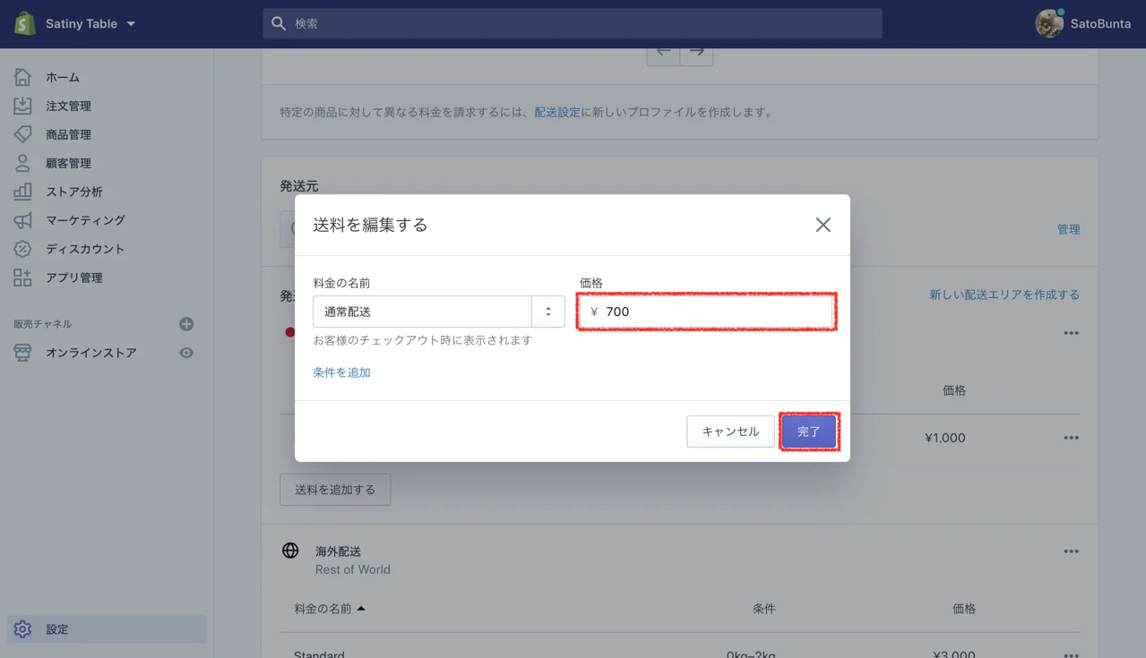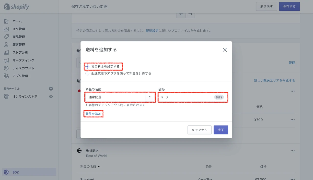 最初に通常料金の設定をしていきましょう。Shopifyのデフォルトの送料が全国一律で1,000円となっているため、任意の送料を入力します。そして最初の通常料金では条件の追加は行わず、[完了]をクリックします。