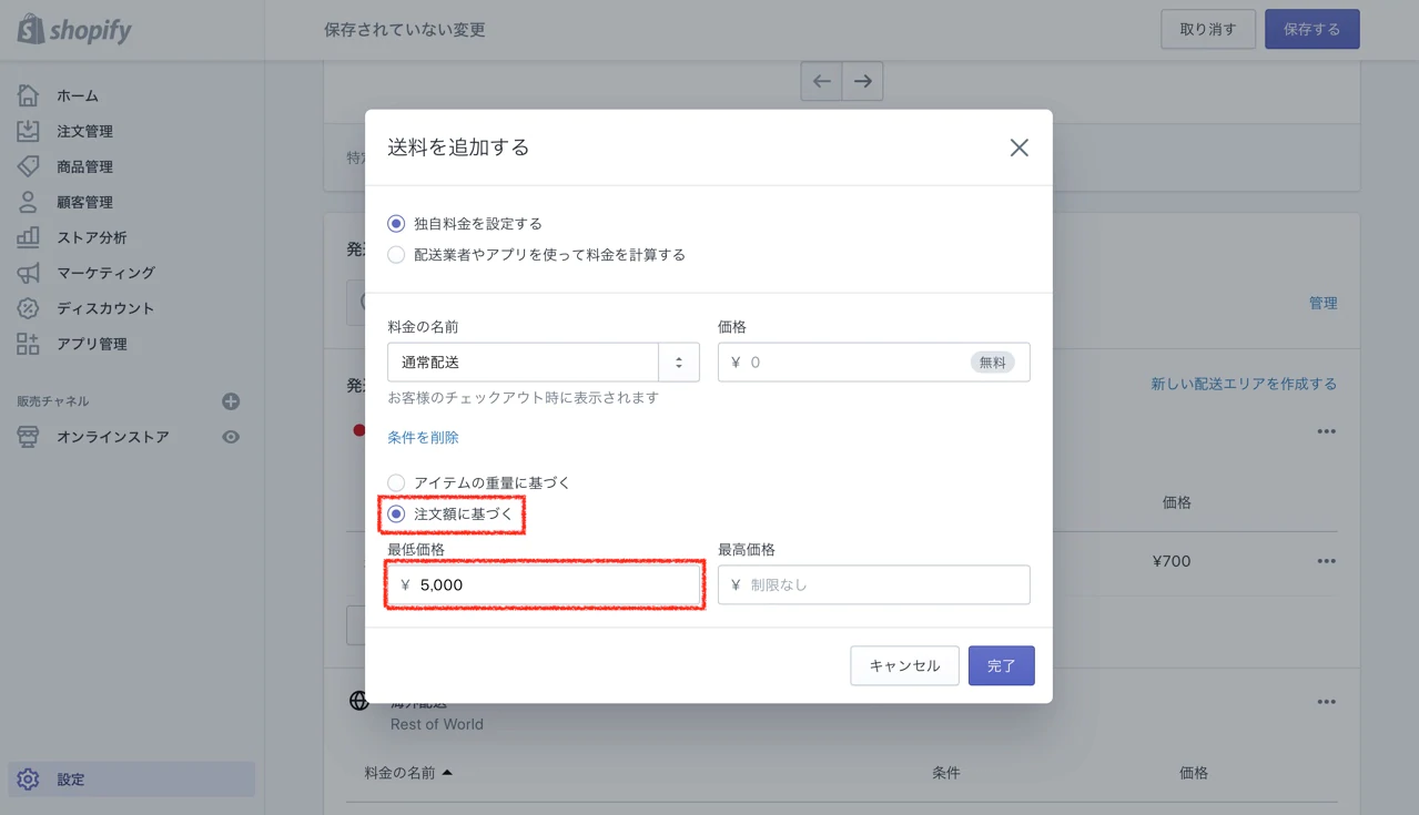 [注文額に基づく]にチェックを入れたら送料無料の[最低金額]を入力します。