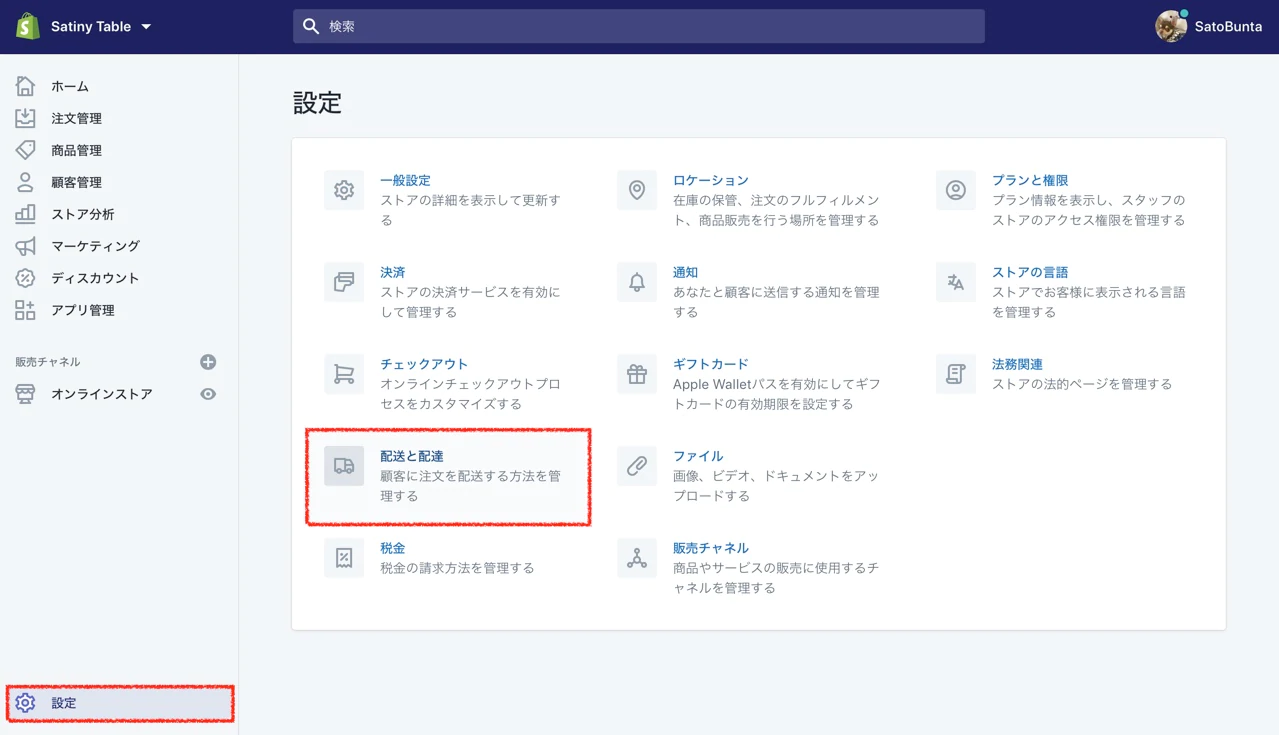 送料計算の条件を設定するにはまず「配送プロファイル」を開きます。Shopify管理画面から[設定>配送と配達]をクリックします。