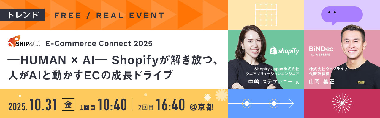 国内外トップレベルのShopifyパートナー、業界リーダーが集結する一大リアルイベント「E-Commerce Connect 2025 in 京都」。送り状発行システムを展開するShip&coが主催し、最新トレンドと実践知が交わるこの舞台に、WEBLIFE代表・山岡義正が登壇します。