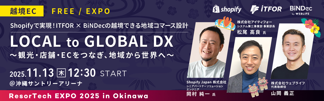 本セッションでは、観光・店舗・EC・物流・情報を一気通貫でつなぐ地域コマースDXをテーマに、Shopify Japanをゲストに迎え、BiNDec × ITFORのクロストーク形式でお届けします。