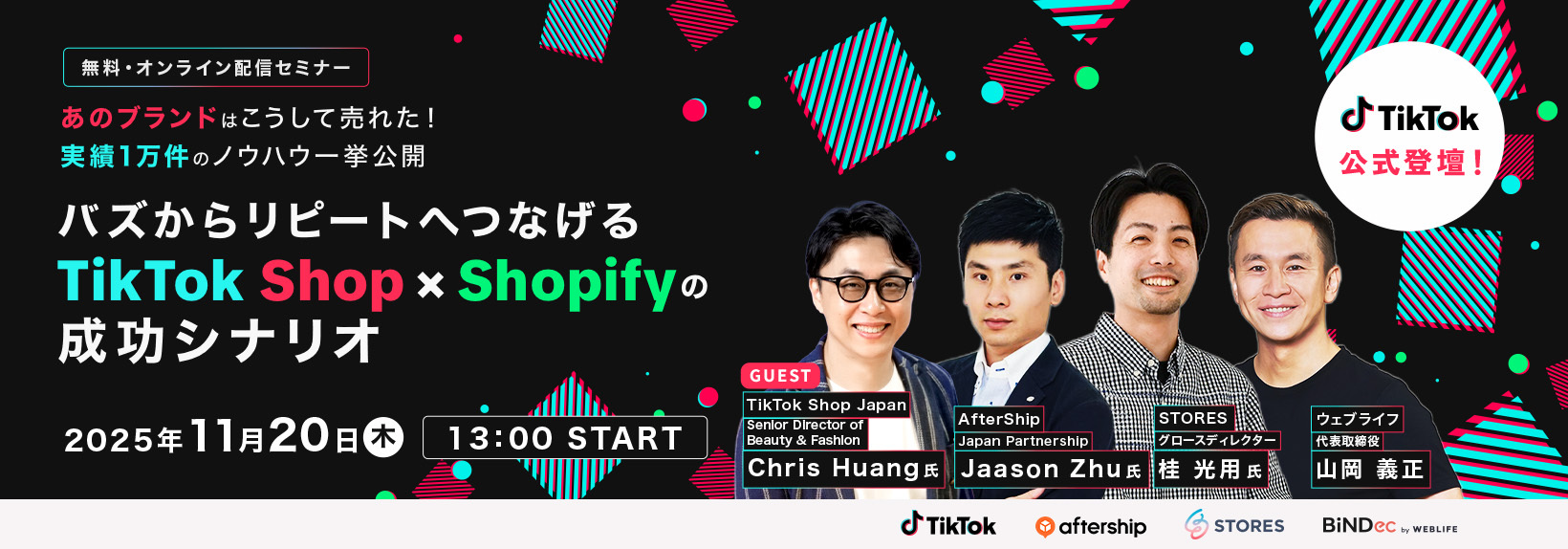 本ウェビナーでは、国内外で1万件以上のTikTok Shop導入実績を持つAfterShipだから知っている成功パターンと、運用効率を高める仕組みを公開。そして、TikTok Shopから生まれた新規顧客をファンに育てるまでのCRM戦略をSTORES ブランドアプリが提案します。